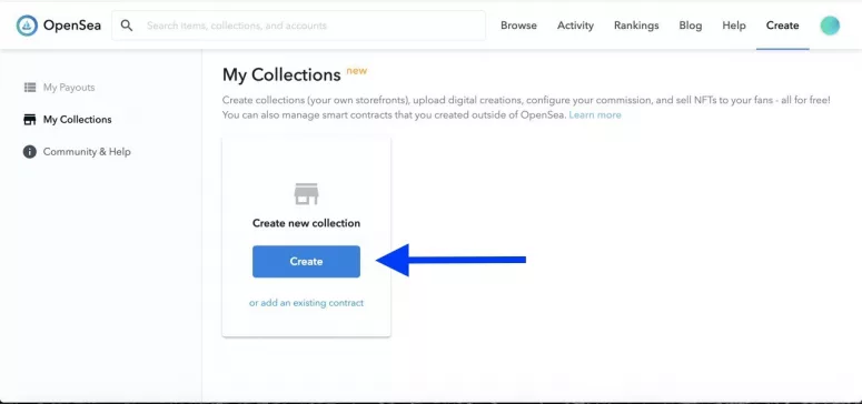 Every NFT marketplace has an option to create an NFT. For example, OpenSea has a “Create” button that you can click to submit NFTs: