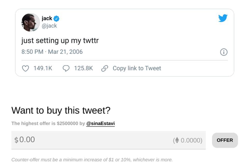 - The first tweet from Twitter CEO Jack Dorsey was sold as an NFT for $2.9 million: