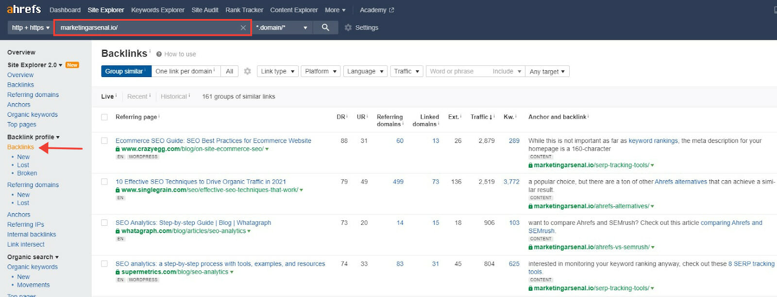 In Ahrefs, you can find this in Site Explorer by clicking on the ‘Backlinks’ report. Here are some things to keep an eye out for when looking at competitor backlink profiles: