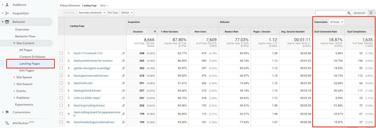 If you haven’t already, you can set up Goals in Google Analytics to track SEO metrics like these. Then, in the Landing Pages report, you’ll find out how many people are taking your desired action per page that they entered through: