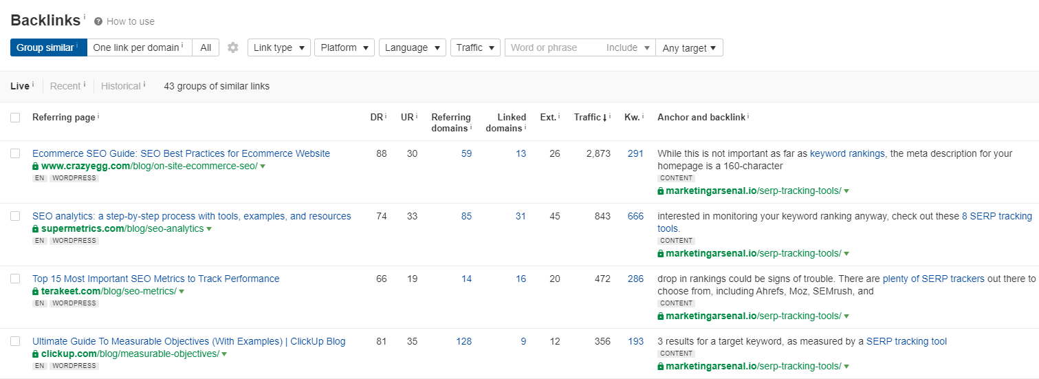 Ahrefs Backlinks report gives an overview of the Domain Rating (DR) and organic traffic from each of your referring pages, which helps to understand at a glance how strong your links are: