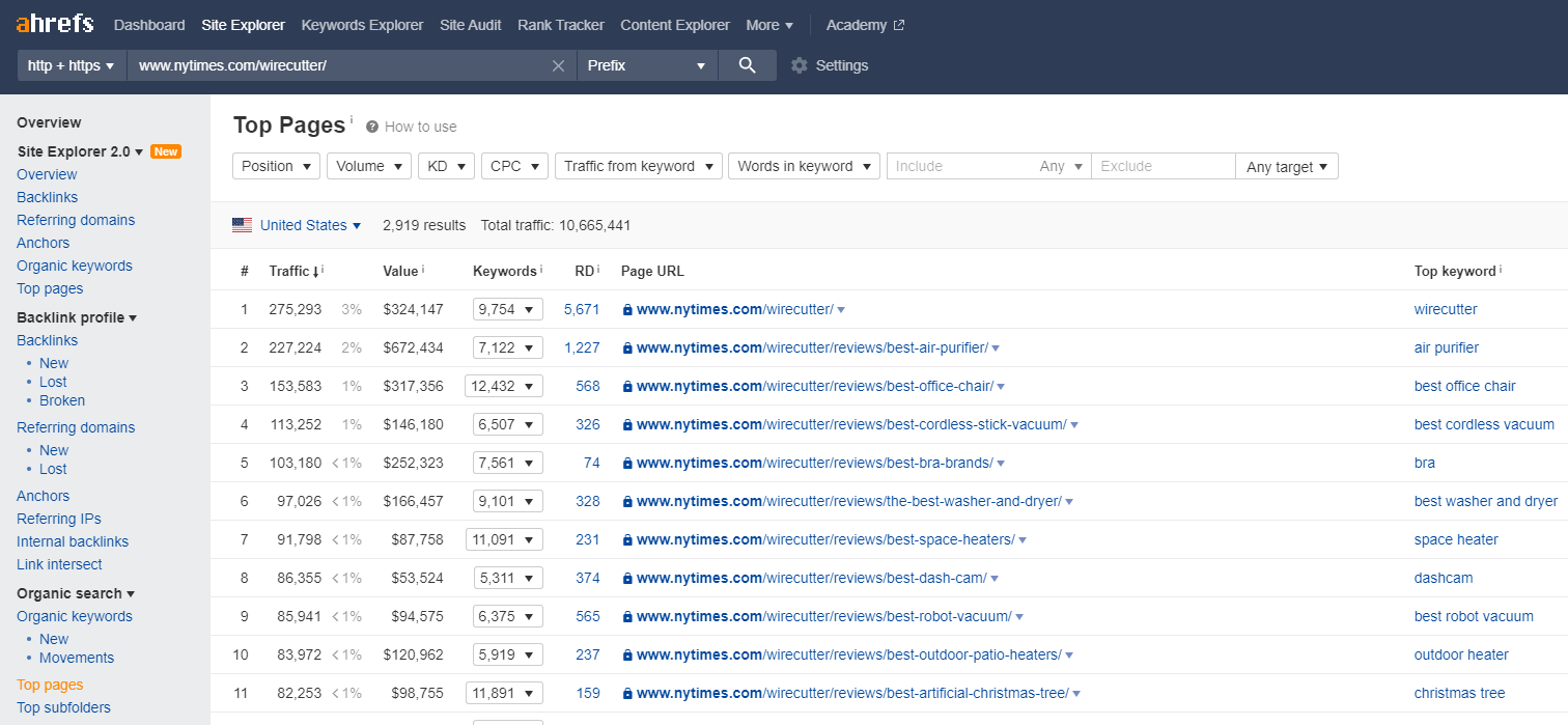 You’ll get a list of the highest traffic pages (based on Ahrefs estimations, not their actual data, but it’s a good indication) by organic clicks:
