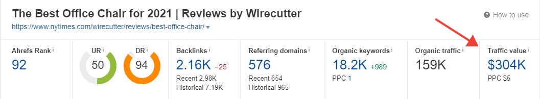 On the other hand, if the keywords that your competitor’s page is ranking for seem to be high-intent keywords (‘best SEO agency’, ‘buy dog food online’, ‘trello alternative’, etc.), then there’s a good chance they’re worthwhile pursuing. Ahrefs offers an estimate for cost-per-click in paid ads for each keyword, which could be helpful. Usually the higher the traffic value, the higher the intent (hence why people are bidding more per click):