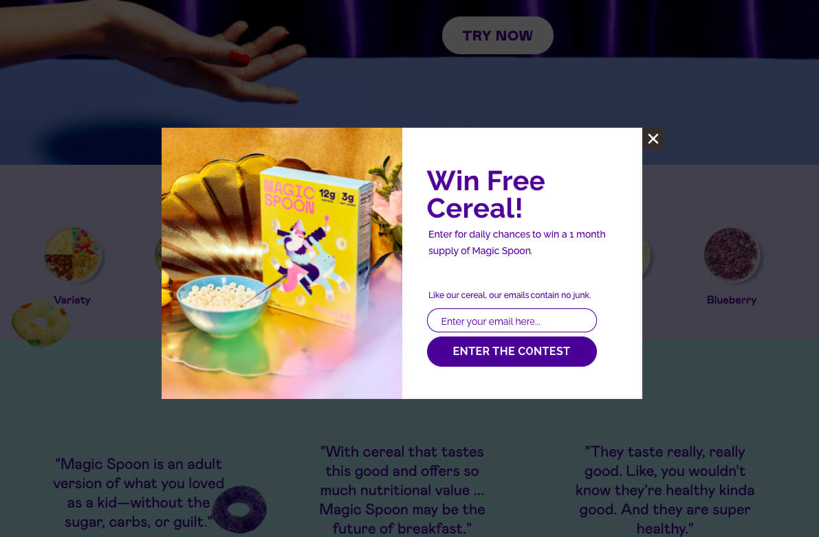 Here’s a perfect example of a home page pop-up from Magic Spoon, a low-carb, high-protein cereal: