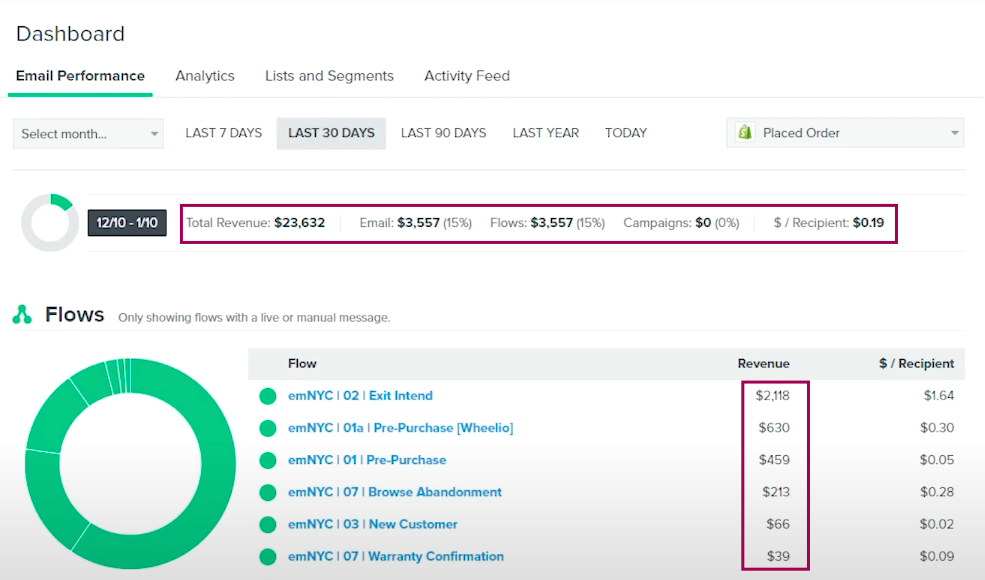- Klaviyo has the most robust analytics dashboard that allows you to see not just how your emails are performing, but how well they’re selling: