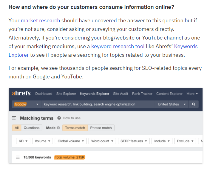 Ahrefs excel at showcasing their product as a solution for the challenge that people are searching for. In this case, if you’re trying to figure out how to create your content strategy, you’ll most likely need to do keyword research at some point.