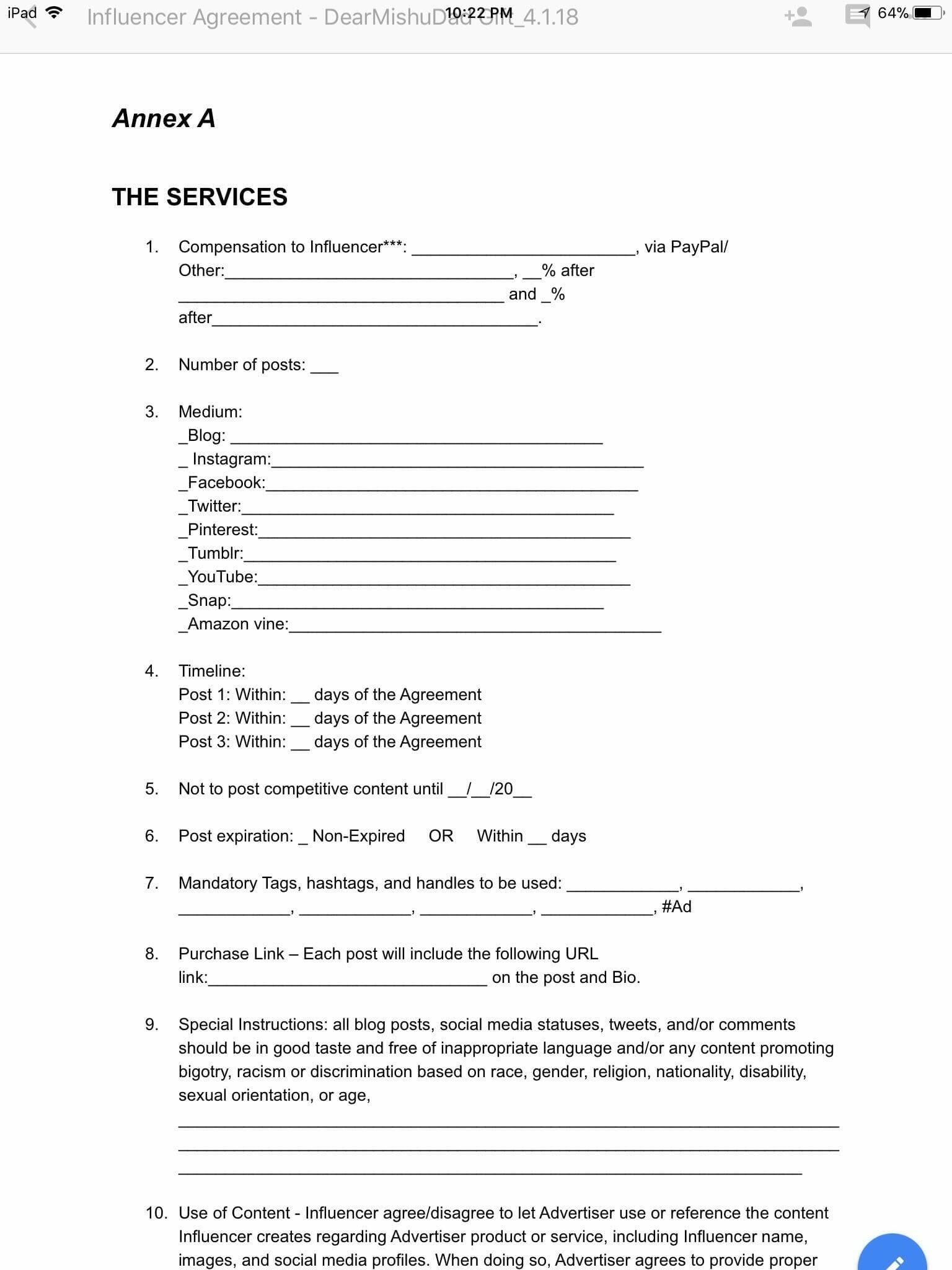 Influencer Marketing Hub offers influencer contract templates as well as some typical points you should include in your own influencer contract: