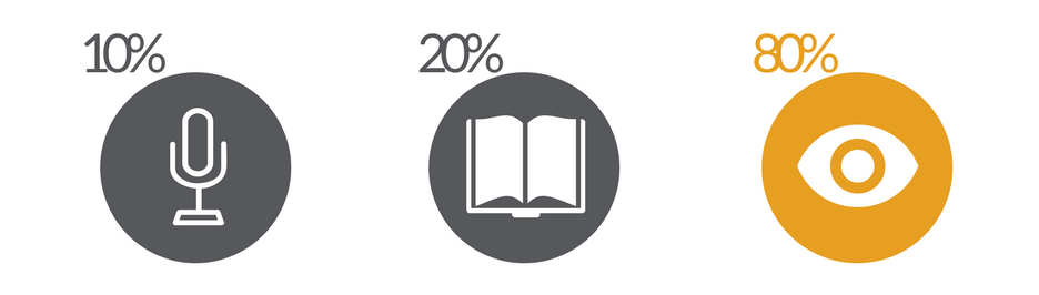 People tend to only retain about 10% of what they hear, 20% of what they read, and 80% of what they see: